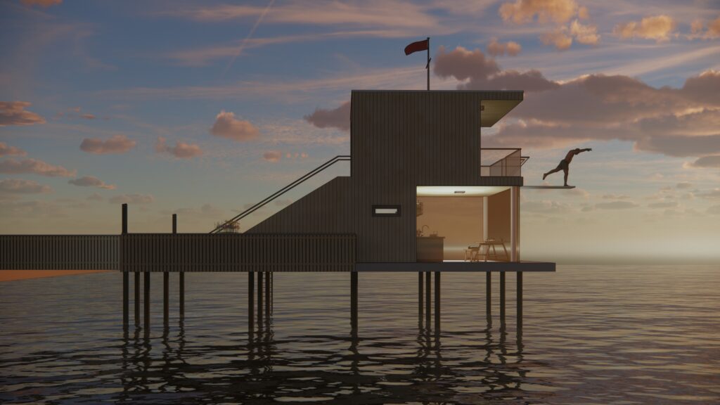 Ontwerp gebaseerd op het Scandinavische kallbadhus concept; een sauna gelegen in zee
